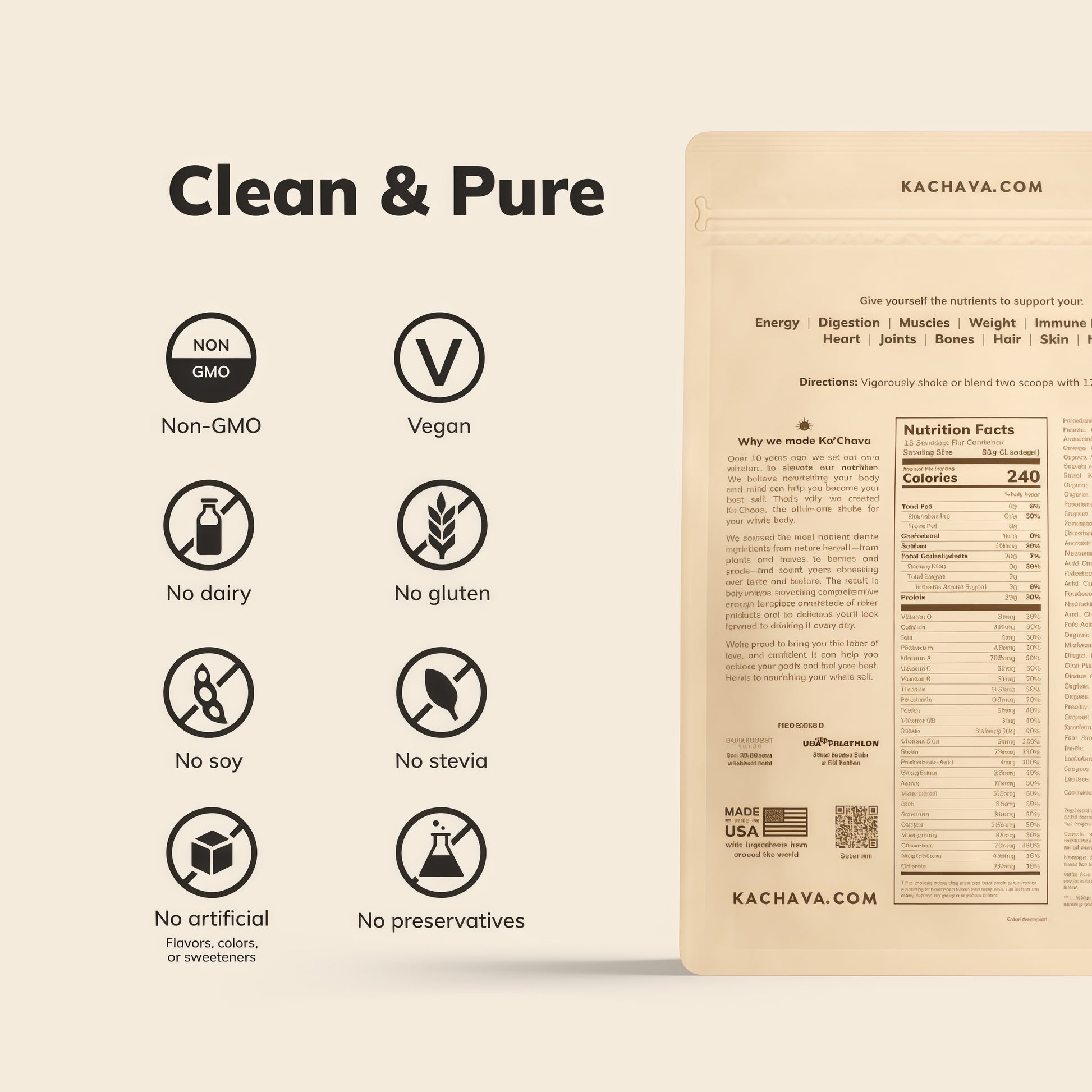 Ka'Chava is smooth & creamy, even with just water. No chalky texture, no funky aftertaste, and no overly sweet or fake-tasting flavors. Five flavors to choose from and endless options for recipes.